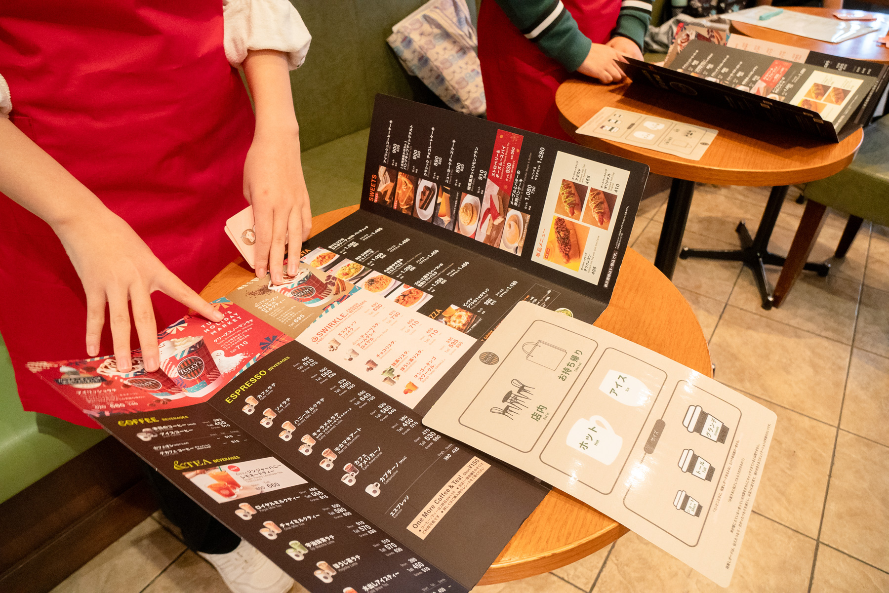 指差しボードや実際にカップを使ってサイズ確認するなど