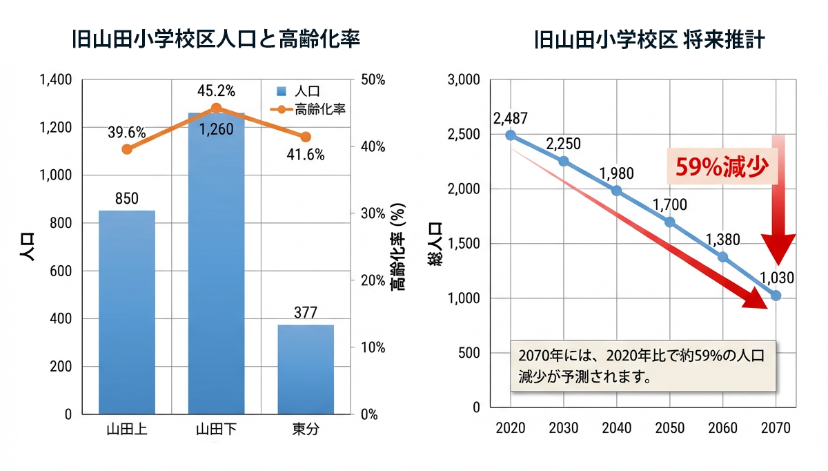 町による推計によりますと、旧山田小学校区(山田上・山田下・東分)の将来推計は、令和2年2,487人から2070年に1,030人、59%の減少率となっています。