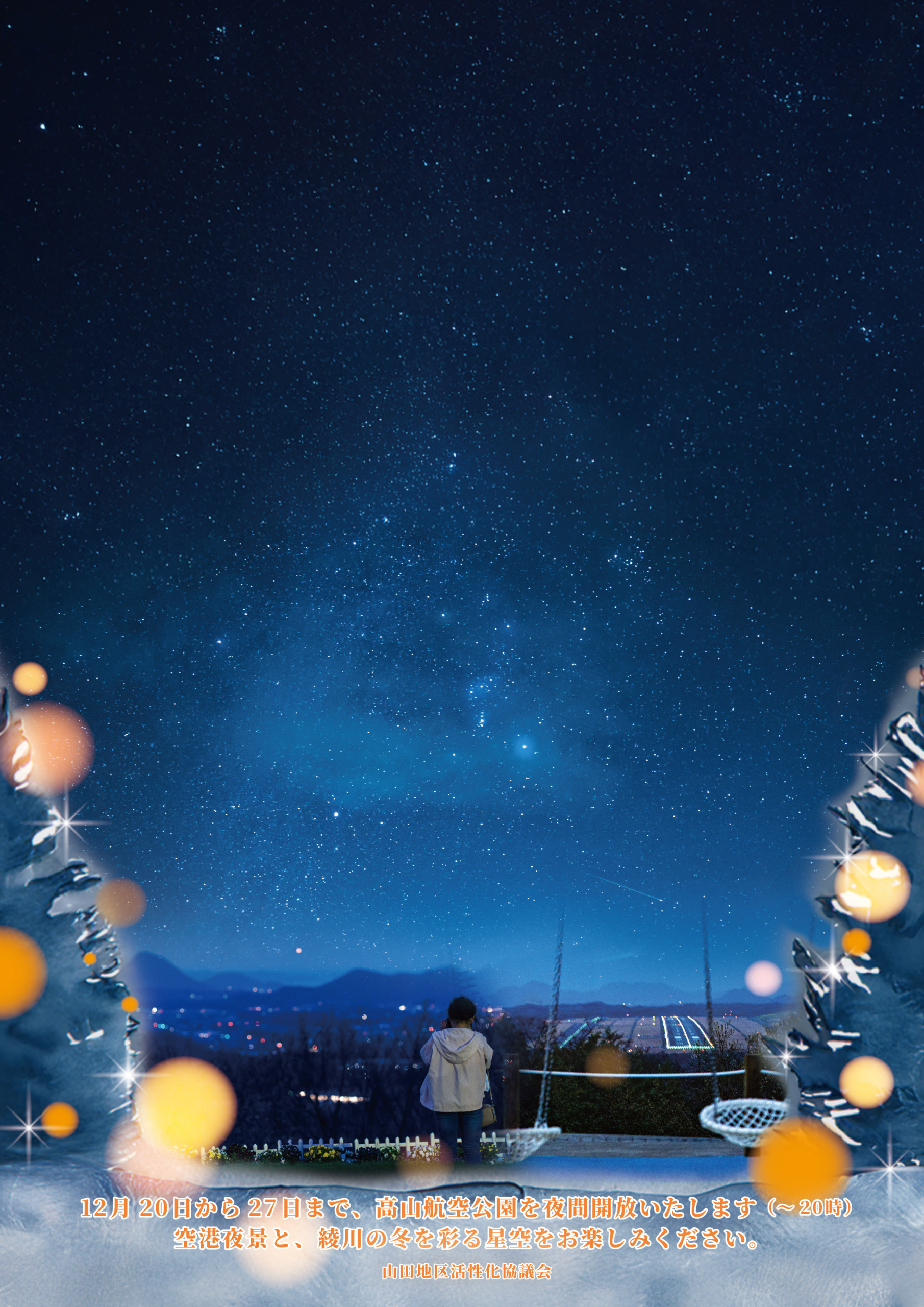 12月20日(土)から27日(土)までの期間、綾川町にあります、「飛行場の見える天空公園」高山航空公園がイルミネーションによるライトアップが施され、夜20時まで特別に夜間開放されます!